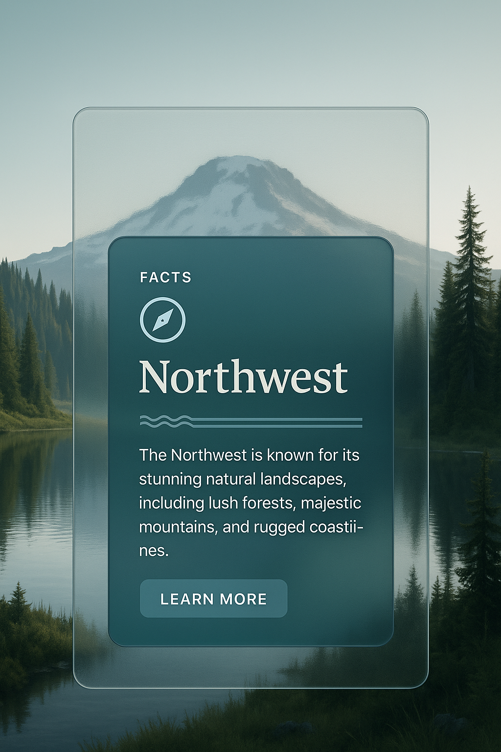 /Collection: /by davooda/Type: PNG/A sophisticated web design featuring a 3D illustration of the Northwest landscape. It includes a transparent overlay with a title, icon, and informative text block, creating a cohesive and visually appealing layout.