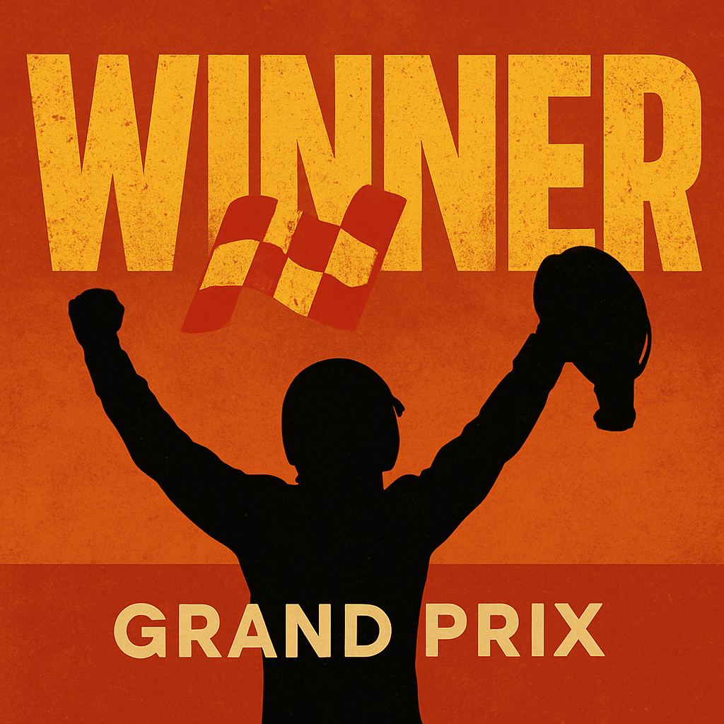 Dynamic graphic illustrating a victorious moment in a Grand Prix event, featuring bold typography and a celebratory theme. Ideal for motorsport promotions or event announcements.