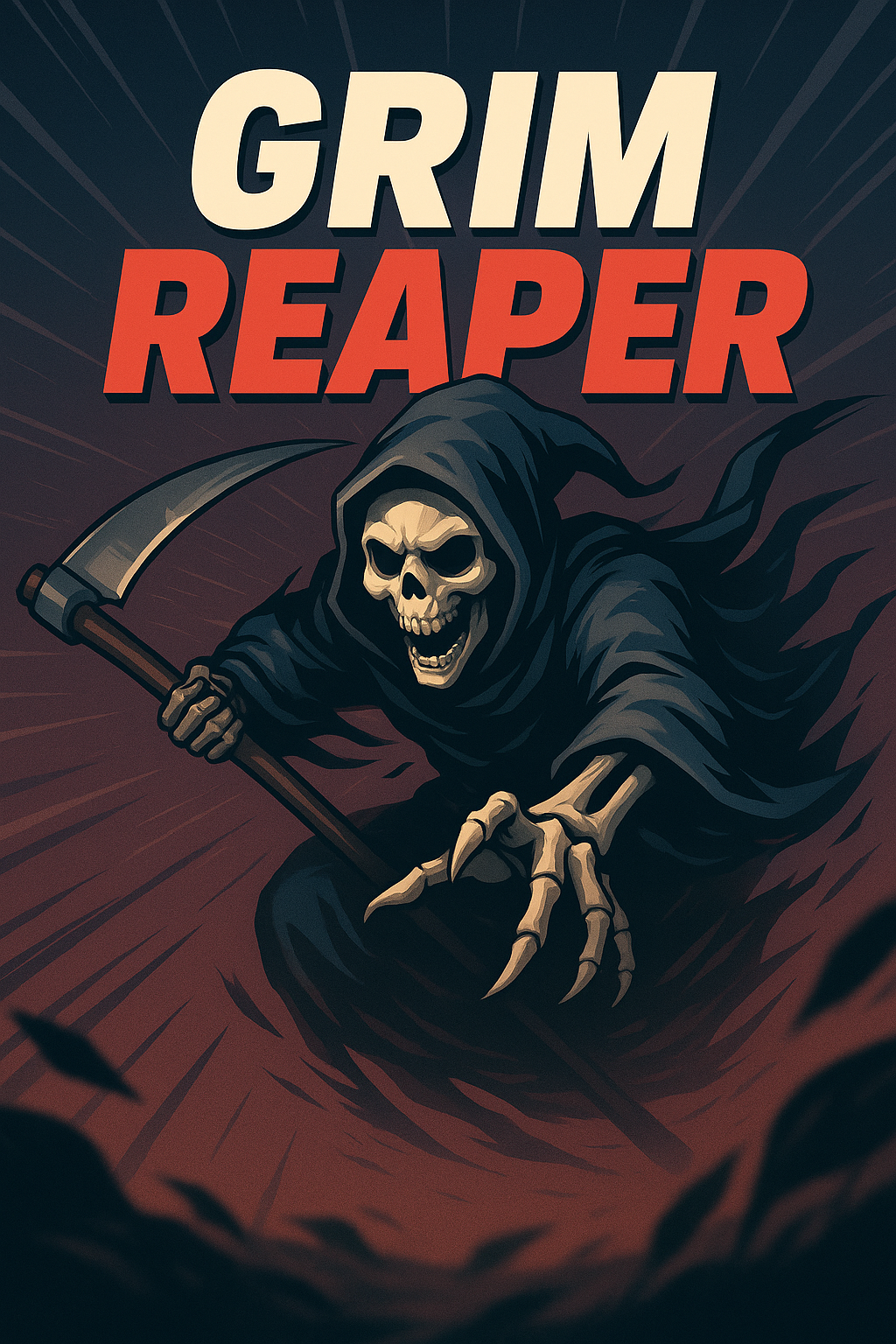 Stylized Grim Reaper Illustration with Bold Typography
