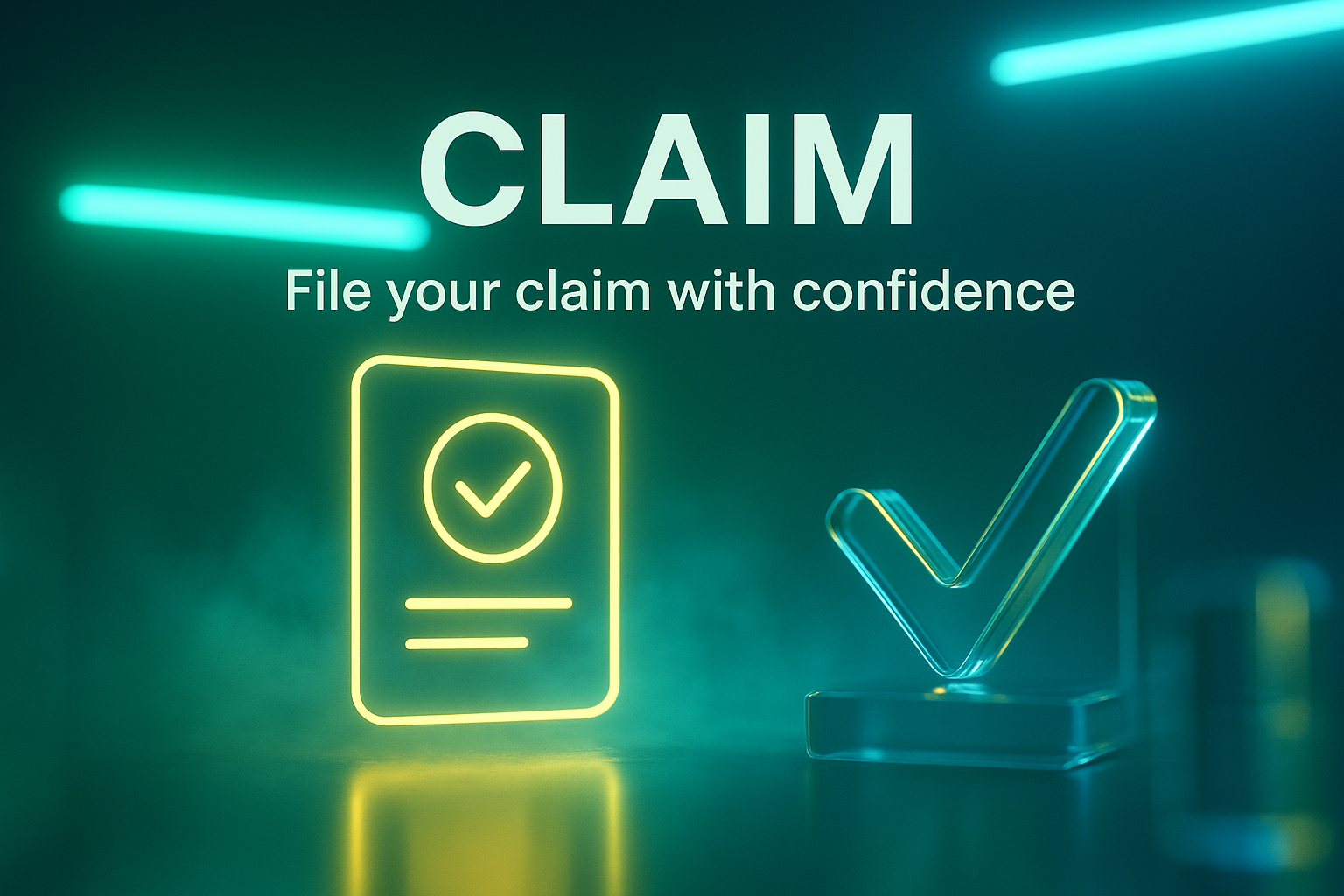 /Collection: /by davooda/Type: PNG/This image features a neon-themed advertisement showcasing the word 'CLAIM' with a glowing checkmark and document illustration. The background is illuminated with soft neon lights, creating a modern and engaging feel.