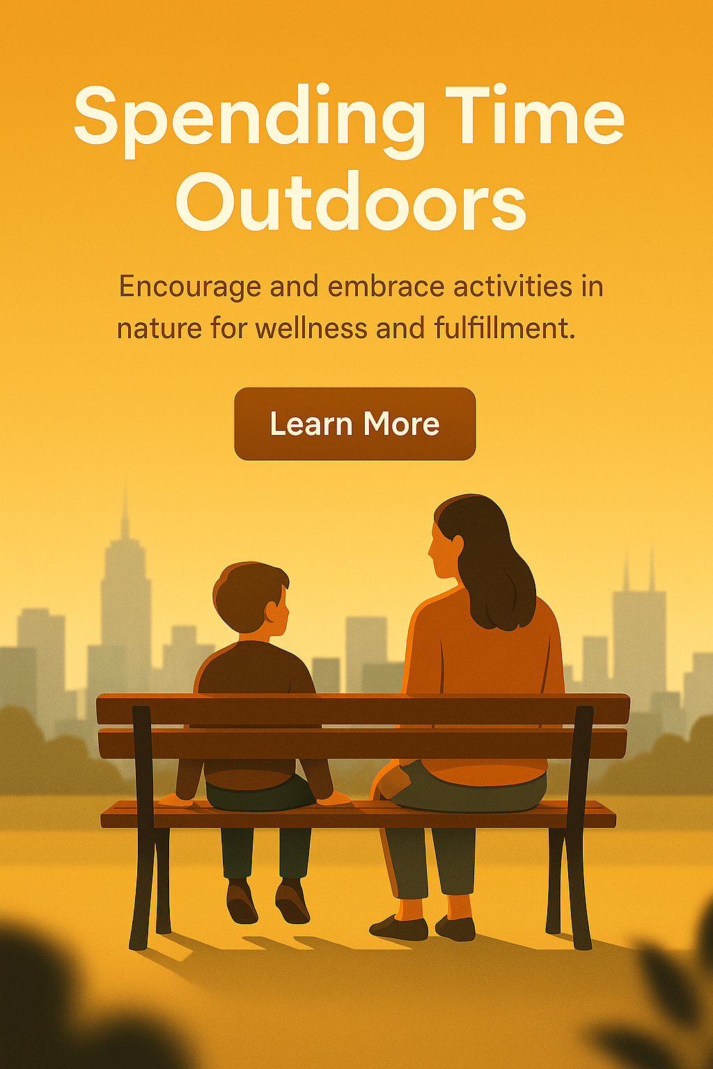 /Collection: /by davooda/Type: PNG/This image is a digital illustration promoting outdoor activities for wellness. It features a parent and child sitting on a bench, conveying a sense of tranquility and connection with nature.