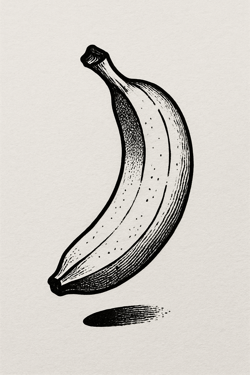 A monochromatic illustration of a banana, featuring intricate line work on a textured background. Ideal for food-related designs, posters, or packaging.
