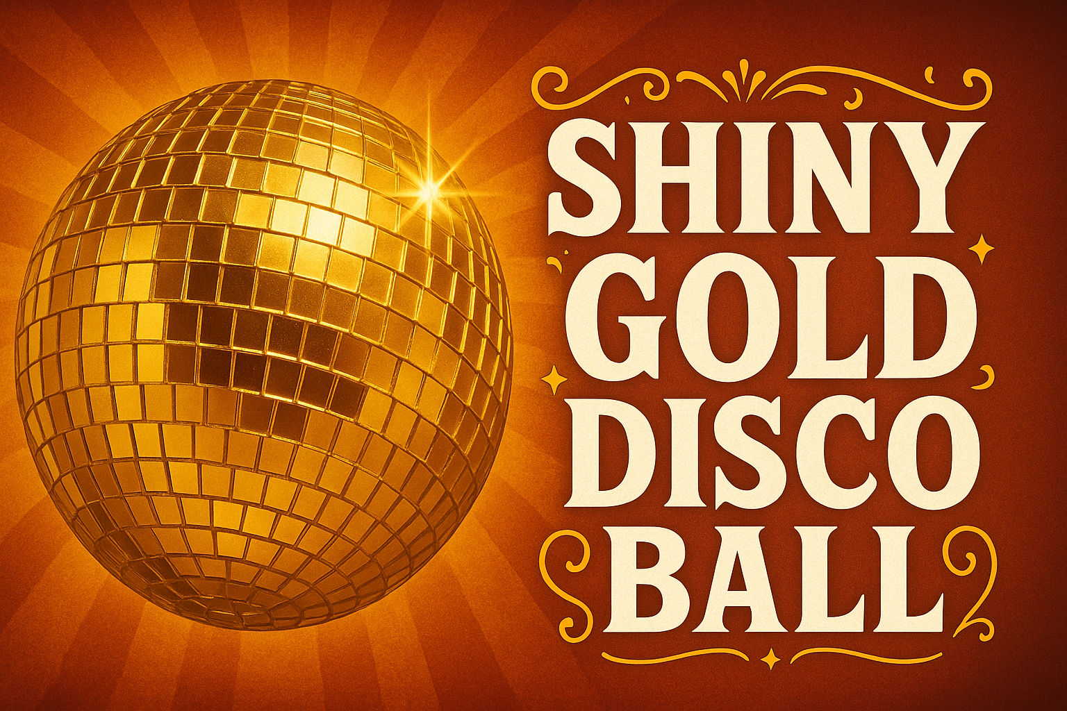 A colorful graphic showcasing a shiny gold disco ball with bold typography, ideal for party promotions, event flyers, or retro-themed designs.