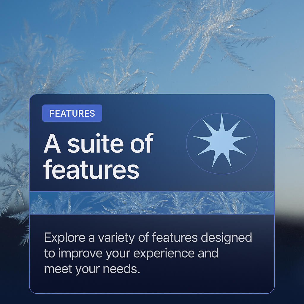 The image showcases intricate frost patterns on a window pane, set against a serene morning sky. An overlay highlights features designed to enhance user experience.