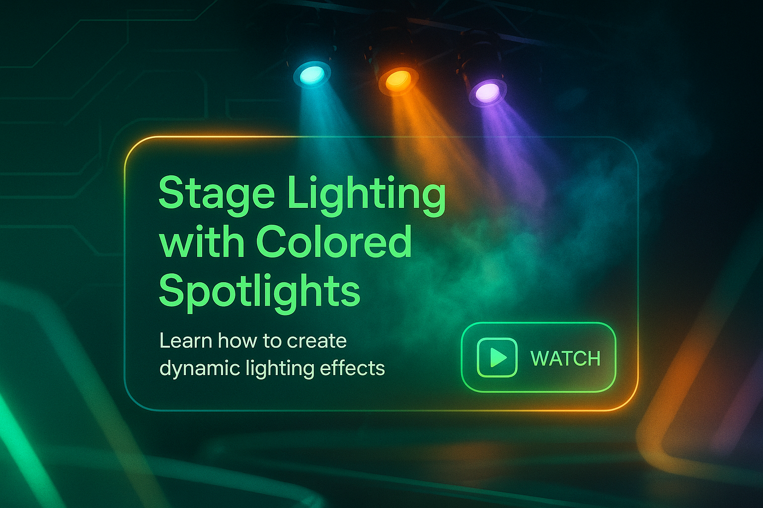Engaging graphic for a tutorial on stage lighting featuring colorful spotlights and a modern design. Ideal for video promotion or educational content.