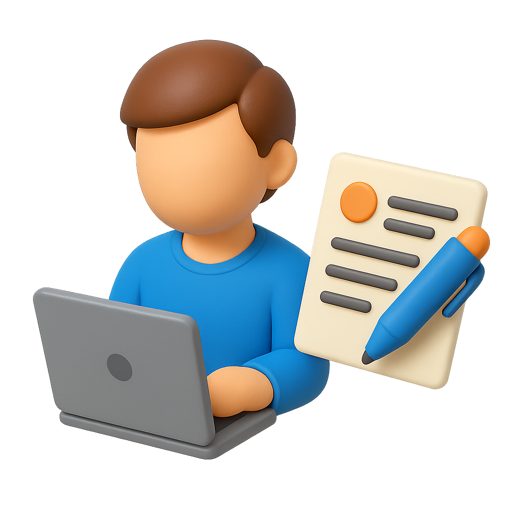 A minimalist 3D icon depicting a figure typing on a laptop, accompanied by a notepad and pen, symbolizing blogging and content creation in a modern style.