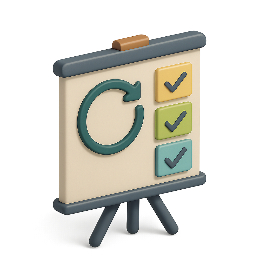 /Collection: /by davooda/Type: PNG/A three-dimensional icon depicting a presentation board with a circular arrow and three colored checkboxes. The icon features a soft, isometric design with a transparent background.