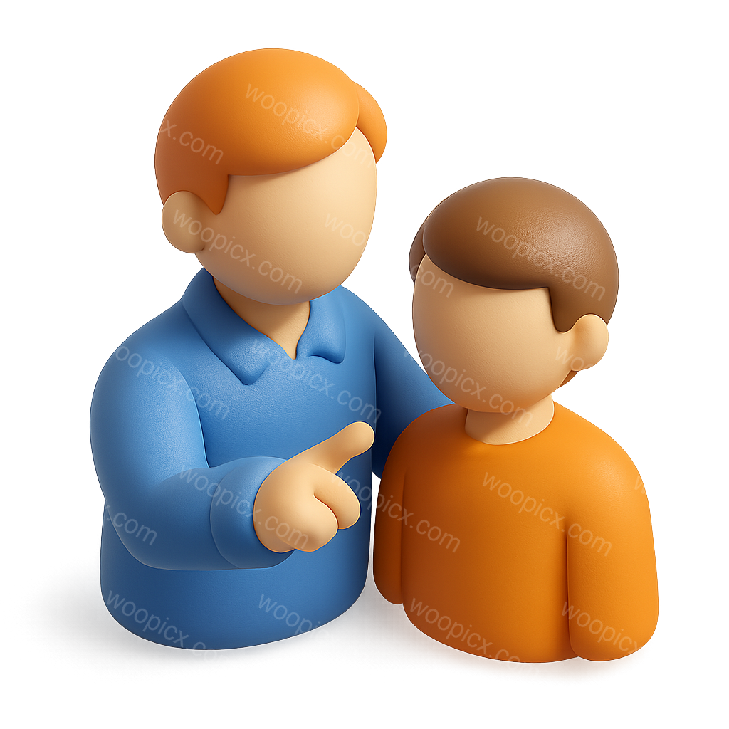 /Premium/Collection: /by davooda/Type: PNG/A 3D icon depicting a mentor guiding a younger person. The mentor, wearing a blue shirt, gestures with a finger, while the mentee in an orange shirt listens attentively. The image has a transparent background and a volumetric, isometric design.