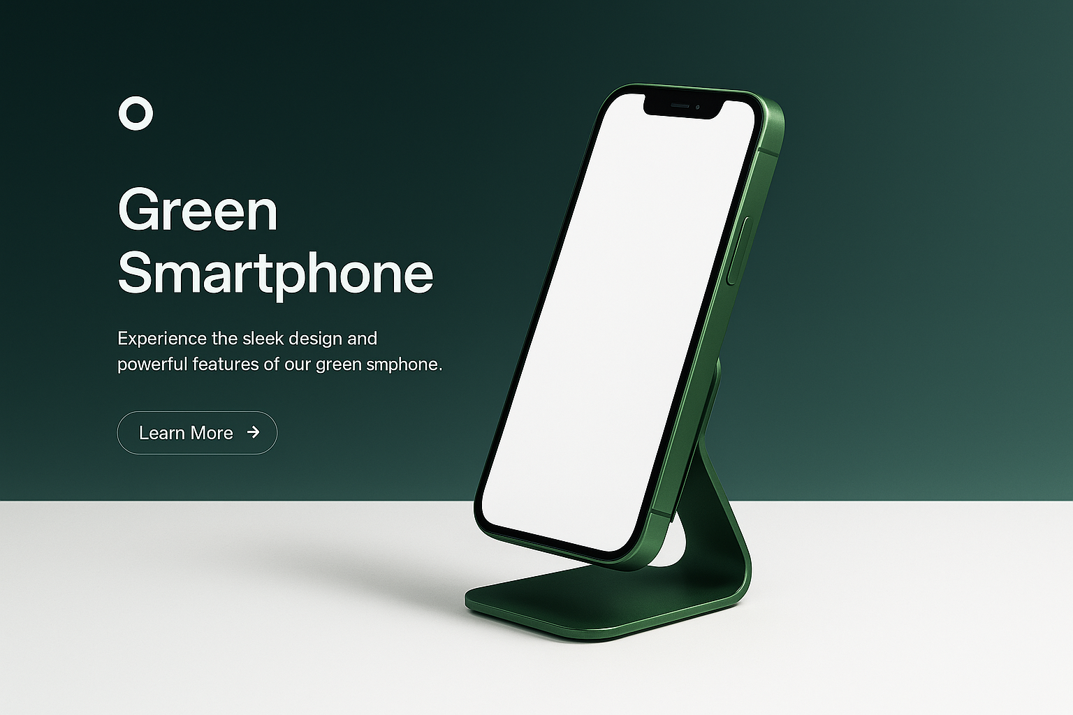 A sleek green smartphone upright on a modern stand, set against a gradient background. Text highlights its design and features, inviting user engagement.