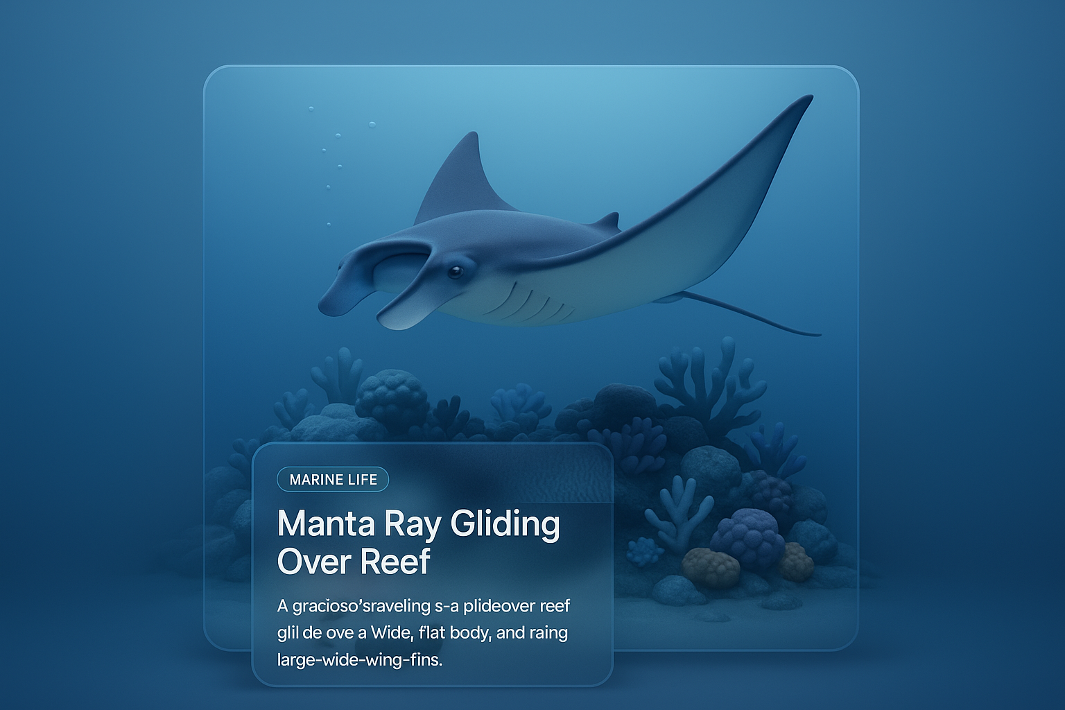 A stunning 3D illustration of a manta ray gracefully gliding over a vibrant reef, surrounded by colorful corals and marine life, framed within a sleek glass-like block.