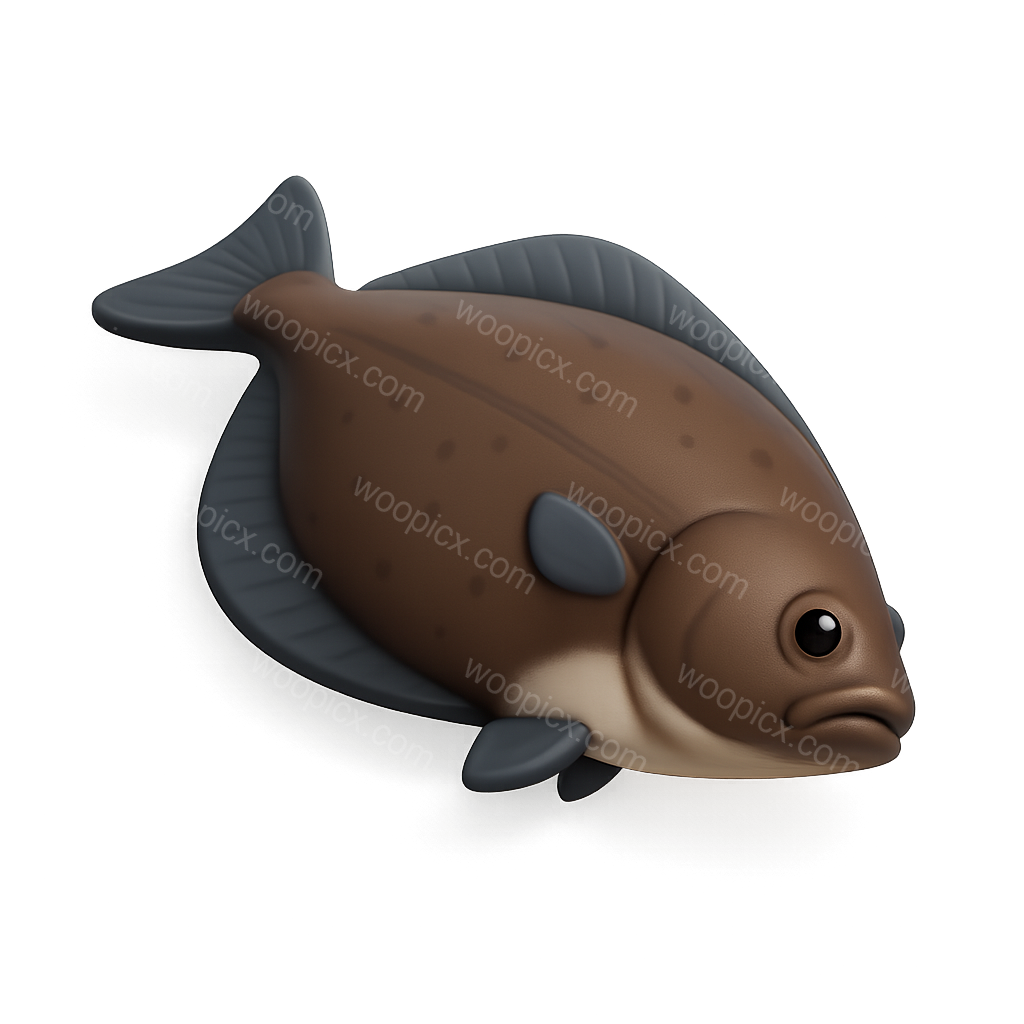 A stylized 3D icon of a halibut, depicted in a three-quarter view with a smooth, volumetric design. The fish features a brown body with subtle shading, enhancing its three-dimensional feel.