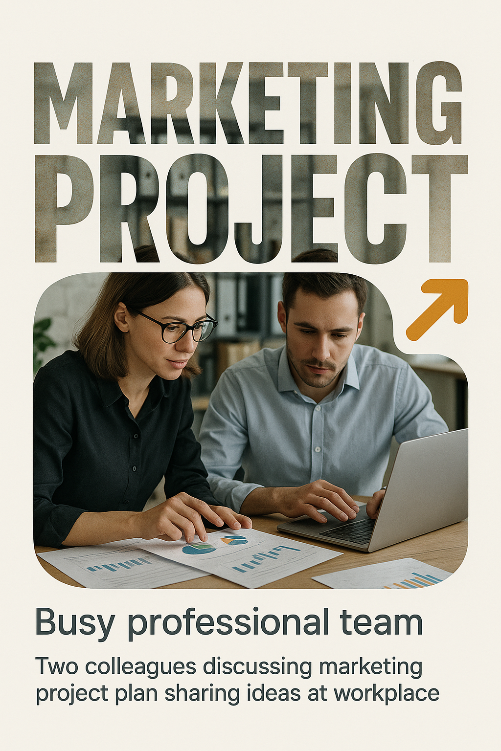 /Collection: /by davooda/Type: PNG/Engaging workplace image of two colleagues analyzing a marketing project. The design features a modern aesthetic with a focus on teamwork and collaboration, suitable for business presentations or marketing materials.
