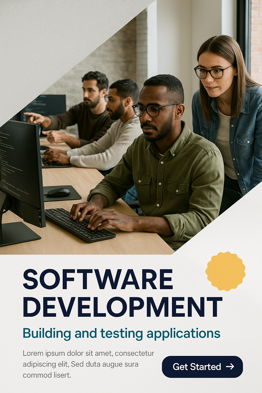 /Collection: /by davooda/Type: PNG/A dynamic team of software developers collaborates on coding and testing applications in a professional workspace, highlighting teamwork and modern technology.