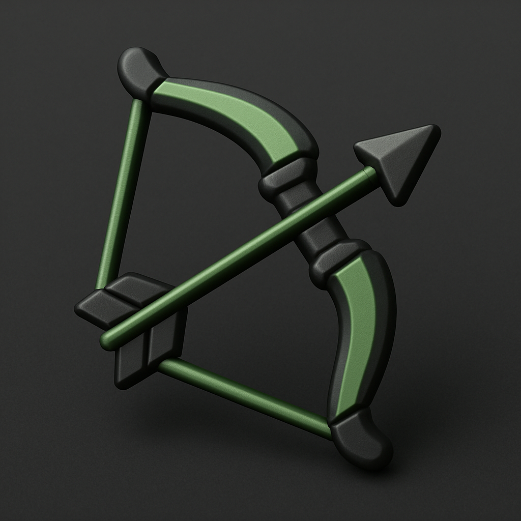 /Collection: /by davooda/Type: PNG/This image showcases a detailed 3D game icon of a bow, featuring a black and green color scheme against a dark gray background. The design emphasizes the bow's shape and texture.