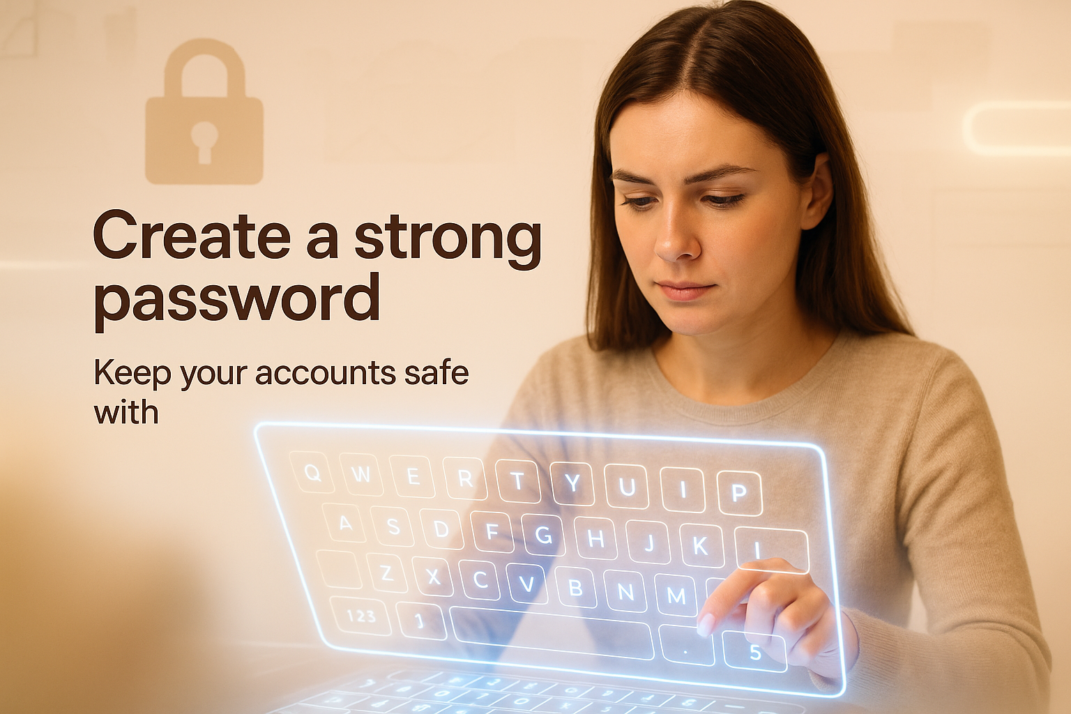 /Collection: /by davooda/Type: PNG/Informative graphic illustrating the importance of creating strong passwords, showcasing a woman interacting with a virtual keyboard. Ideal for digital security campaigns.