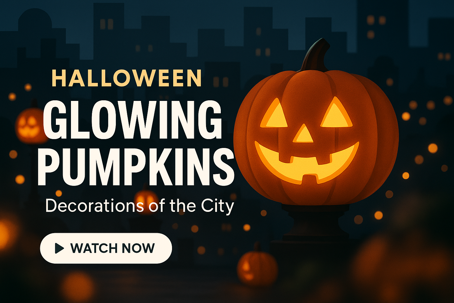 Festive Halloween social media post showcasing glowing pumpkins set against a city backdrop, designed to engage audiences for seasonal promotions.