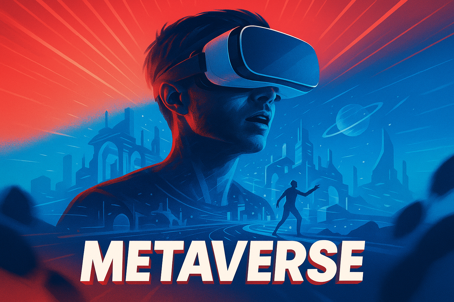 A vibrant depiction of a futuristic metaverse featuring a person in a VR headset amidst a dynamic landscape. The image uses a tri-color effect with layers of depth.