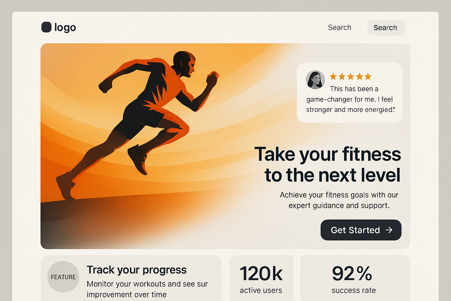 /Collection: /by davooda/Type: PNG/A sleek landing page design featuring a dynamic runner silhouette, showcasing fitness goals with a bento-style layout. Includes action buttons, testimonials, and performance metrics.
