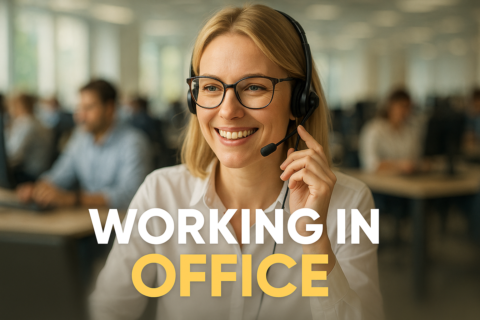 /Collection: /by davooda/Type: PNG/A vibrant office scene showcasing a smiling employee wearing a headset, perfect for corporate communication or customer service themes. The modern workspace enhances productivity.