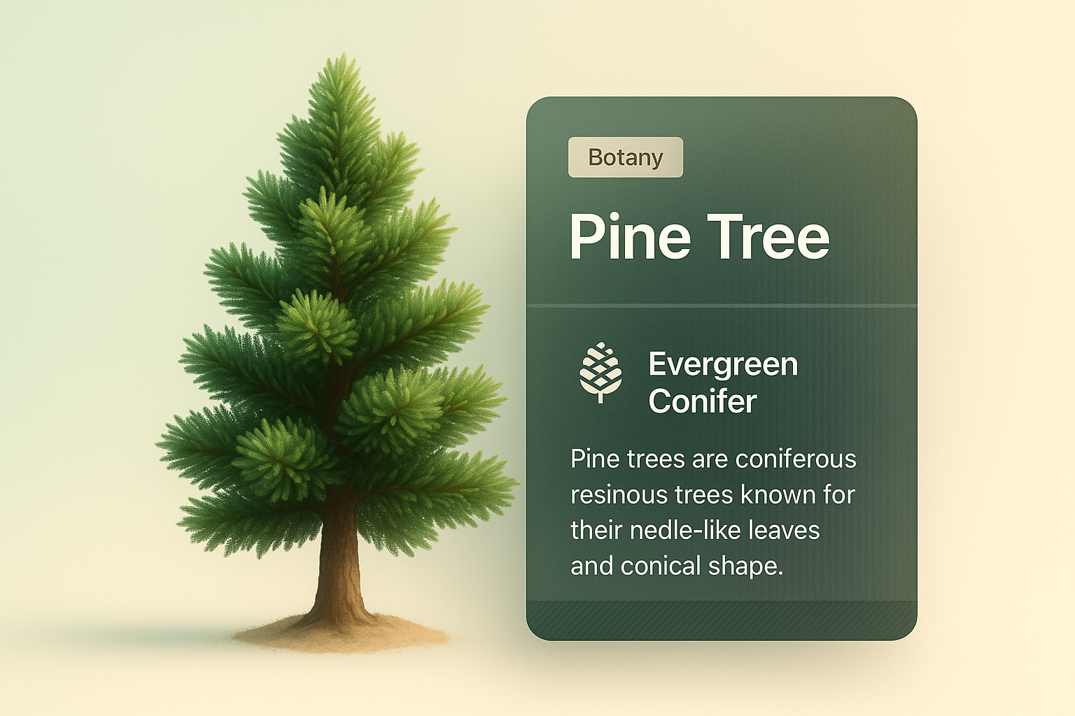 /Collection: /by davooda/Type: PNG/A web page design showcasing a 3D illustration of a pine tree alongside a modern informational block. The block includes a title, icon, and descriptive text on a softly colored background.