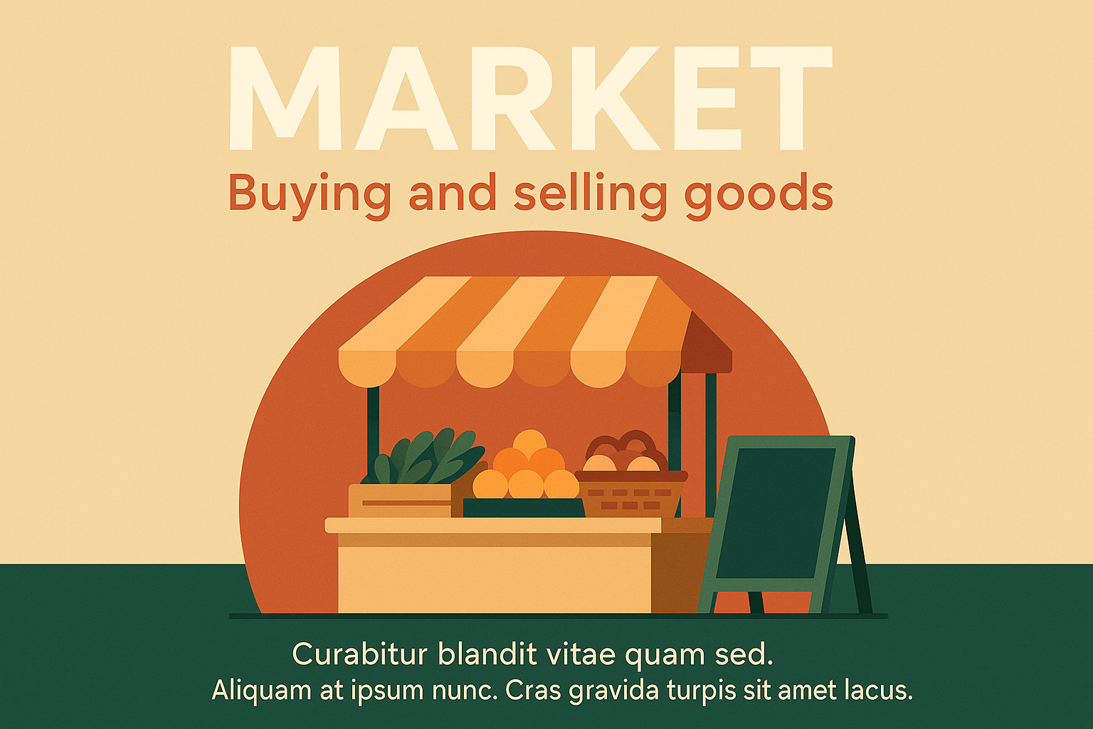 A visually appealing market scene featuring a stall with fruits and vegetables. The design employs a layered composition with a gradient background and a clear hierarchy of text.