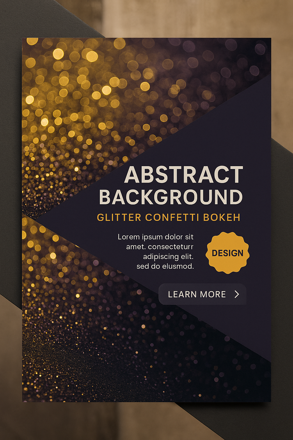 /Collection: /by davooda/Type: PNG/A visually striking gold and purple abstract background featuring glitter confetti and bokeh effects. The design includes layered geometric shapes, creating depth and interest.