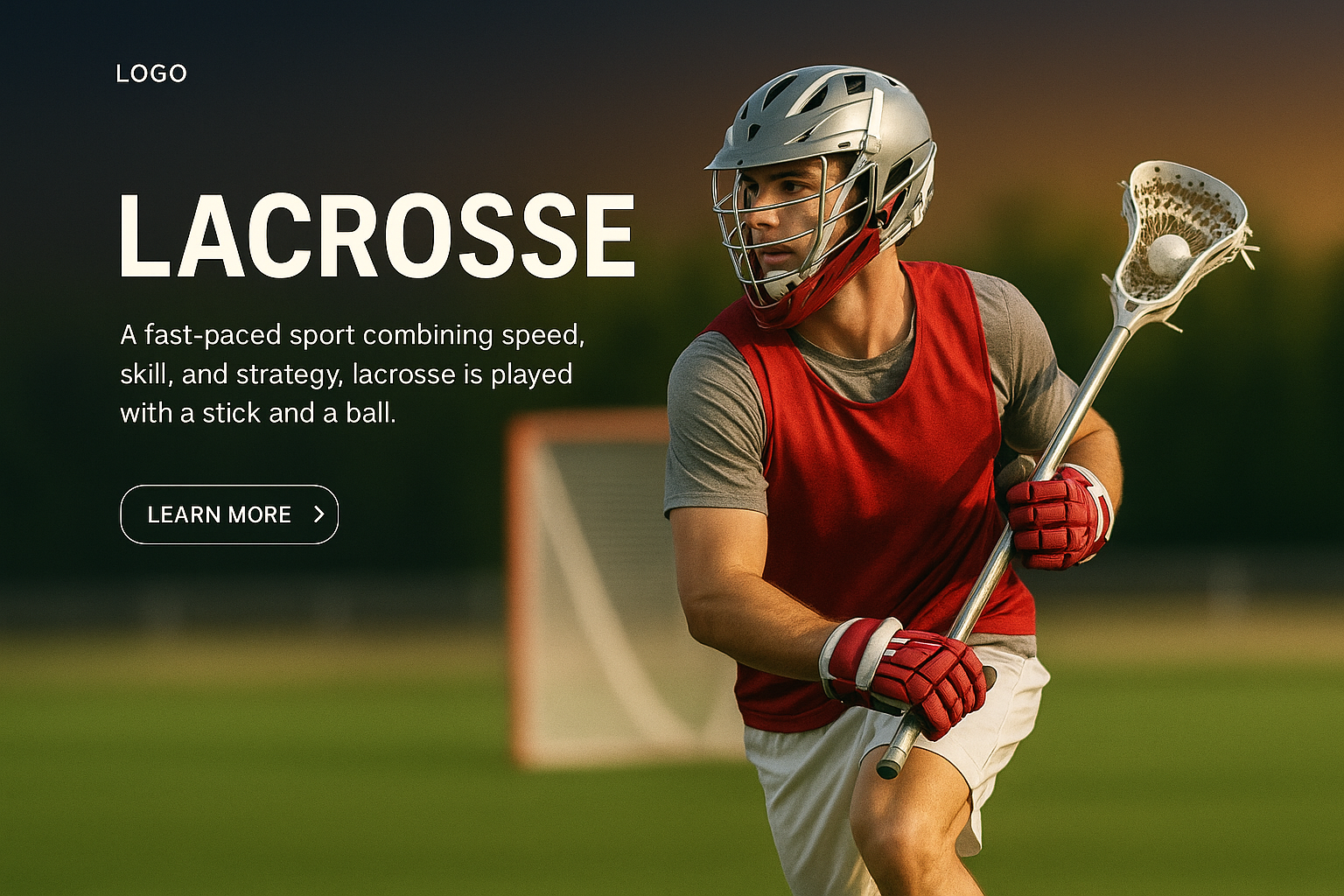 /Collection: /by davooda/Type: PNG/A vibrant web design mockup featuring a lacrosse player in action. The layout includes a logo, a brief description, and a call-to-action button, all set against a gradient background.