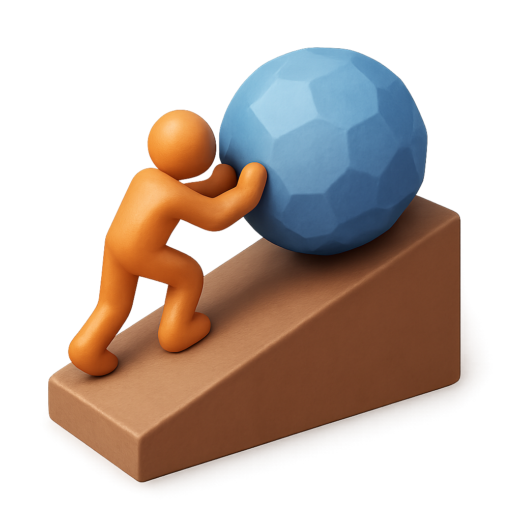 /Collection: /by davooda/Type: PNG/A 3D icon illustrating the concept of persistence, featuring an orange figure pushing a blue geometric shape on a brown base. The design emphasizes depth and isometric perspective.