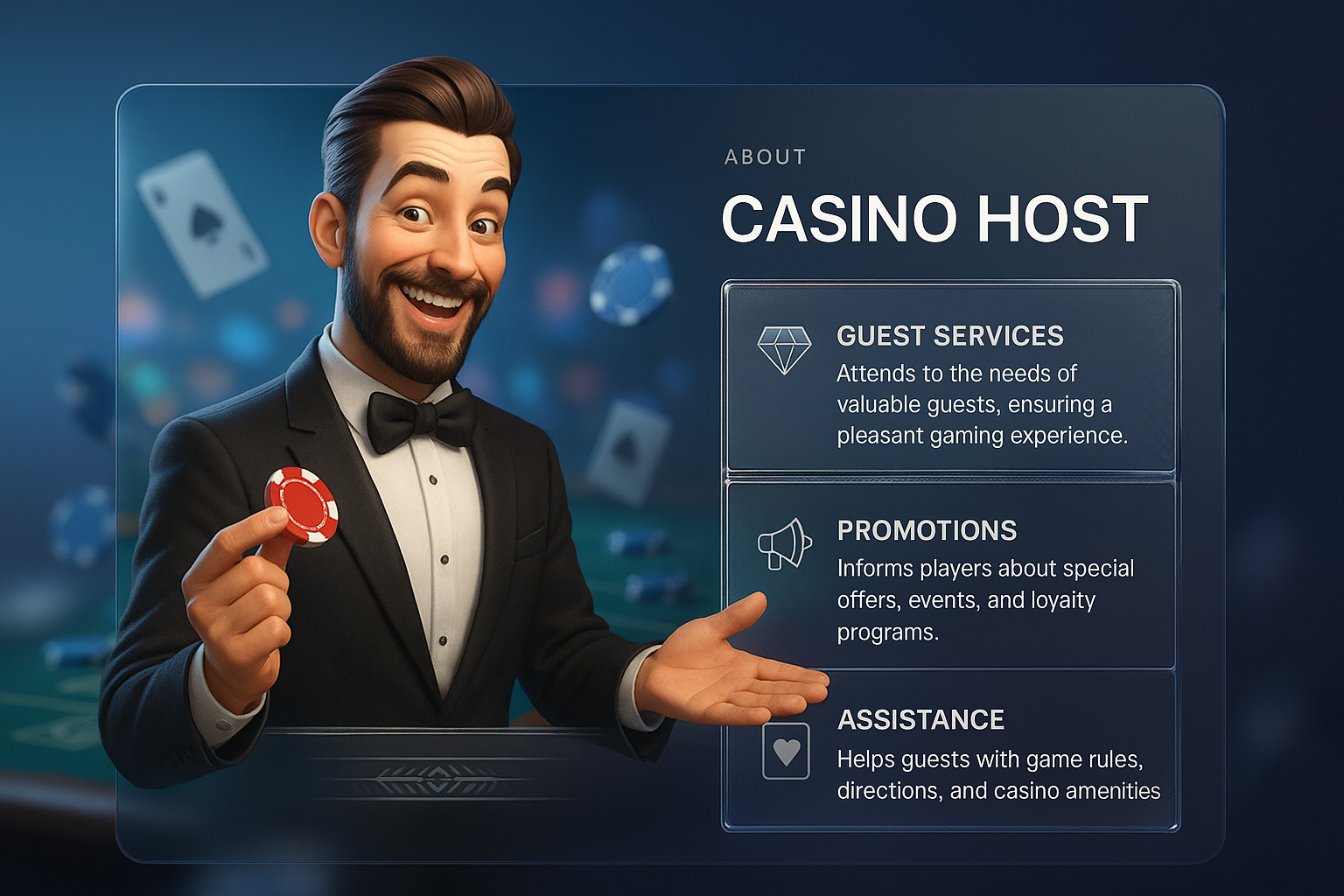 /Collection: /by davooda/Type: PNG/A vibrant 3D illustration of a casino host presenting guest services, promotions, and assistance features. The design incorporates a smooth gradient background and layered elements for depth.
