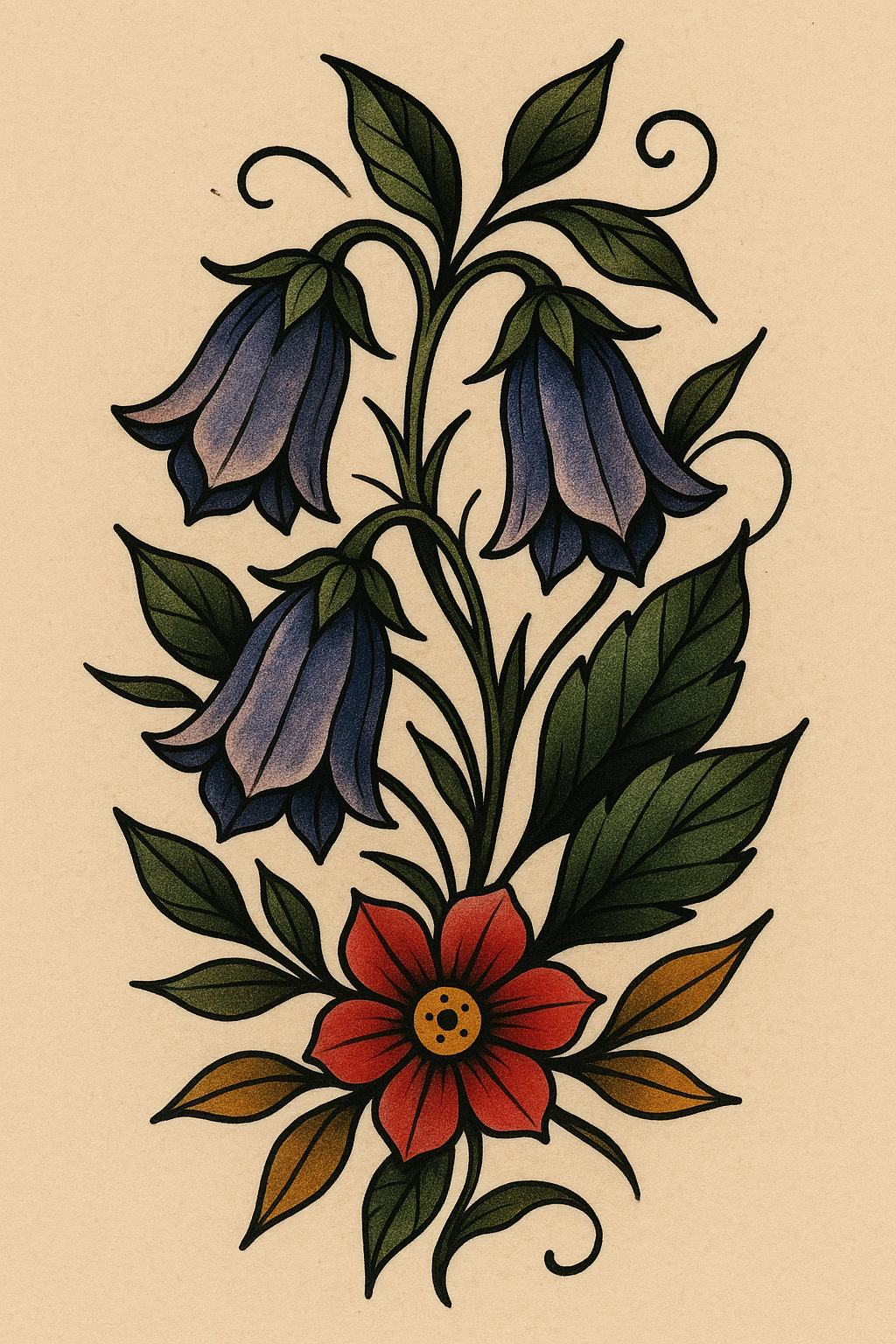Colorful Floral Illustration Featuring Bell Flowers and Leaves