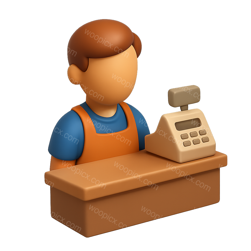 /Premium/Collection: /by davooda/Type: PNG/A simple 3D icon depicting a shopkeeper behind a counter. The character is shown in a three-quarter view with a transparent background, emphasizing a volumetric and isometric design.