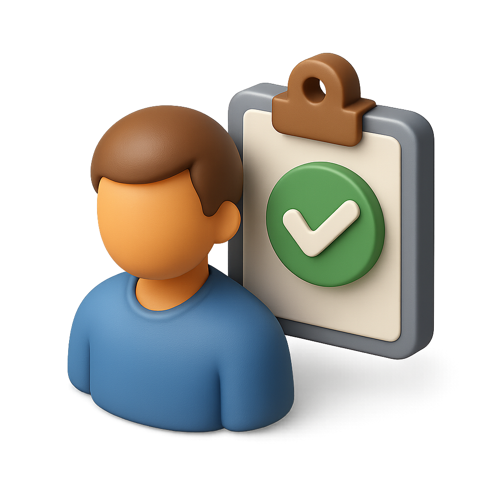 A colorful 3D icon featuring a character with a checkmark on a clipboard. The design has a transparent background and is presented in a three-quarter isometric view, emphasizing depth and volume.