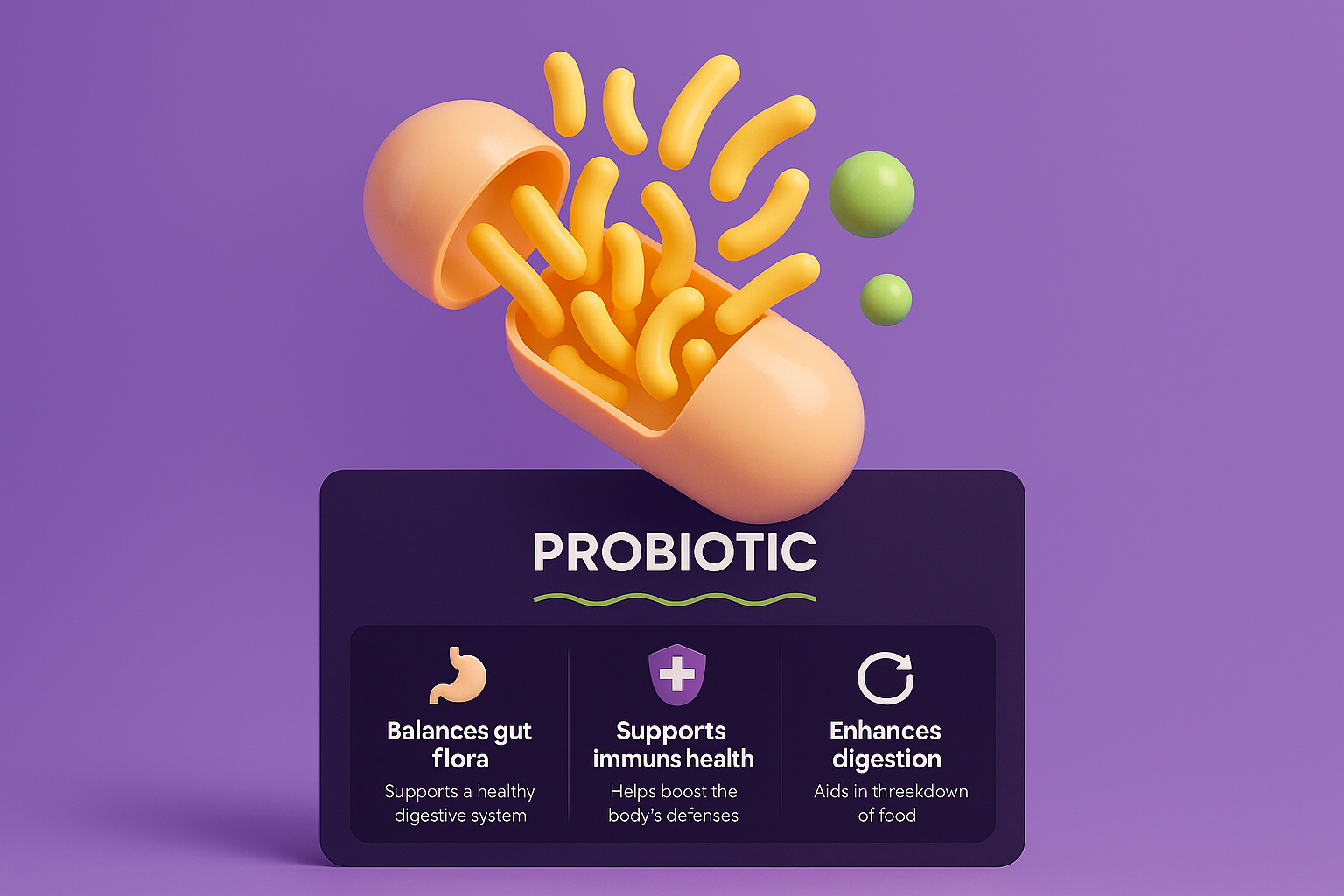 A vibrant 3D illustration of a probiotic capsule spilling out colorful bacteria, set against a smooth gradient background. The design includes a dark label with feature descriptions, enhancing the visual appeal.