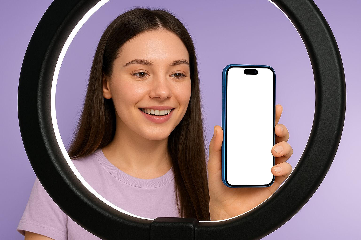 A young female blogger smiles while holding a blue phone inside a ring light. The phone screen is blank, and the background is a soft purple.