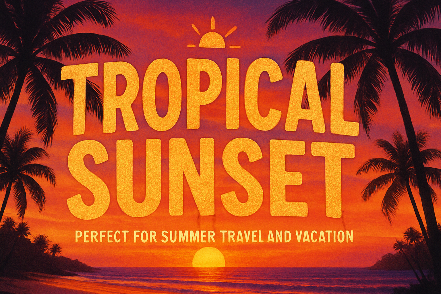 Vibrant tropical sunset scene featuring palm trees and bold text, ideal for summer travel and vacation promotions. Perfect for social media or travel-related marketing.