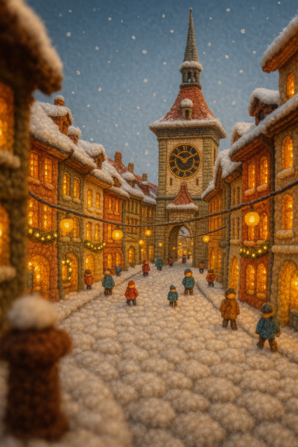 /Collection: /by davooda/Type: PNG/A charming 3D depiction of Bern's Old Town, crafted to resemble woolen threads. The scene features a snowy street with twinkling lights, tiny figures strolling, and a clock tower, creating a cozy holiday atmosphere.