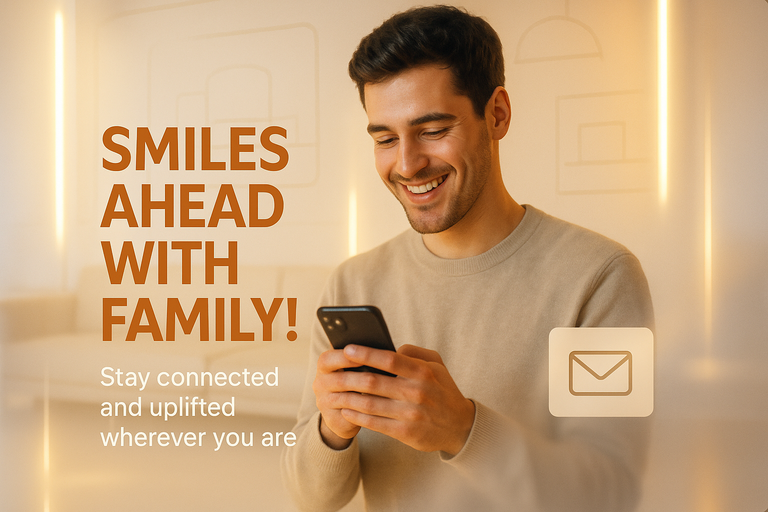 A vibrant social media post featuring a smiling man using a smartphone, promoting family connectivity with warm colors and modern design elements. Ideal for family-oriented marketing campaigns.