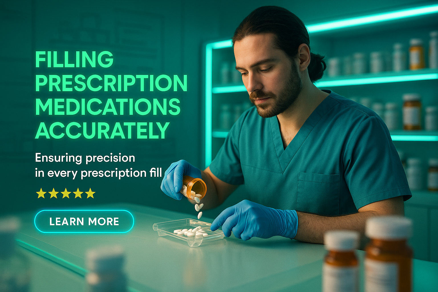 /Collection: /by davooda/Type: PNG/A professional pharmacy setting showcasing a pharmacist accurately filling prescription medications. The image features a focused individual in scrubs, emphasizing precision and care in medication handling, ideal for healthcare marketing.