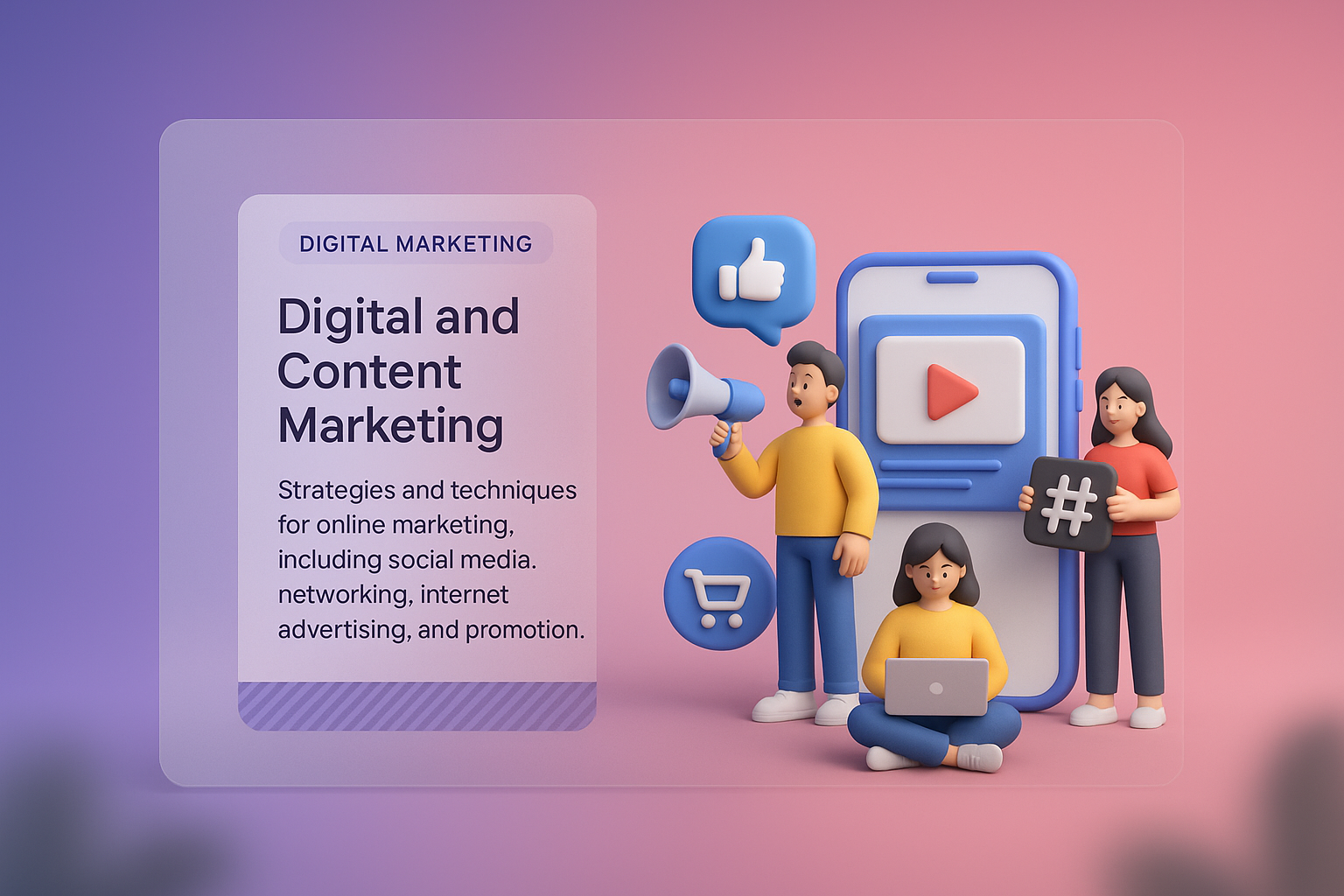 /Collection: /by davooda/Type: PNG/A vibrant 3D illustration showcasing people engaged in digital and content marketing activities, featuring a mobile device, social media icons, and promotional elements.