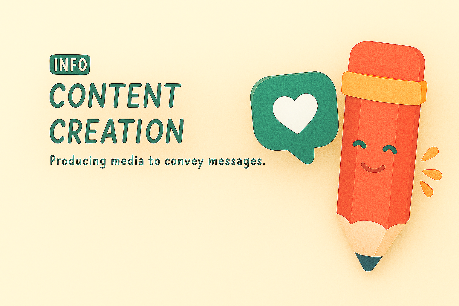 A vibrant and playful graphic illustrating the concept of content creation, featuring a cheerful pencil and speech bubble. Ideal for educational or marketing purposes.