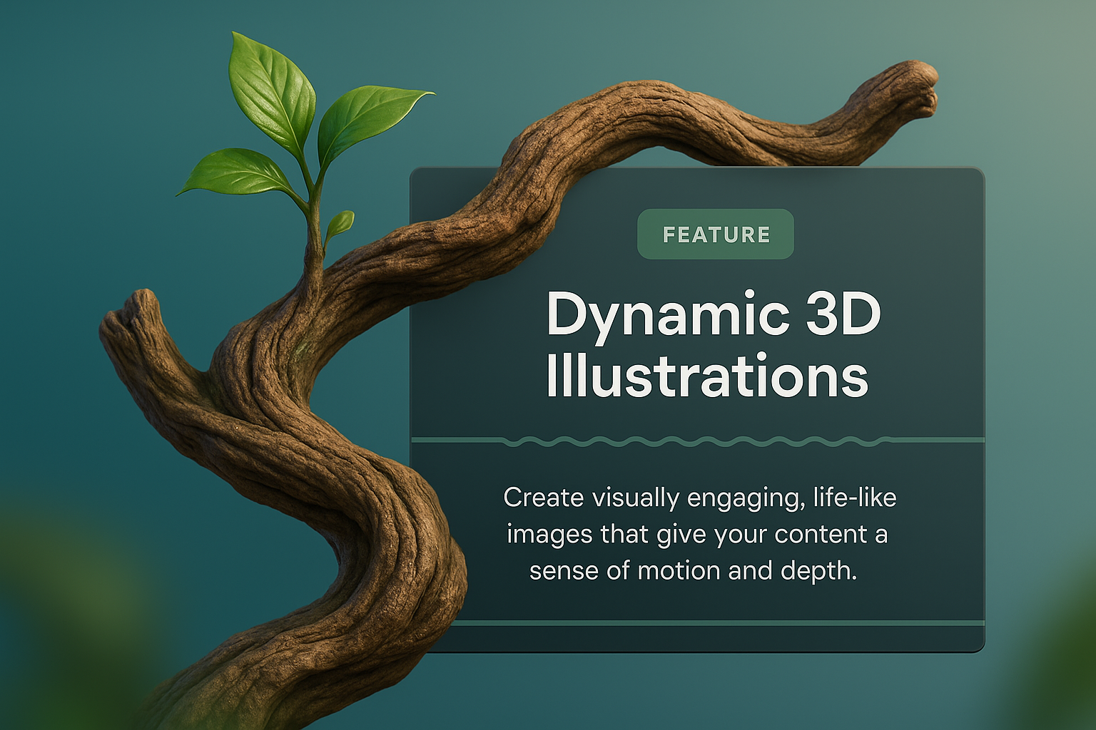 /Collection: /by davooda/Type: PNG/A realistic 3D illustration of a twisted jungle branch, featuring a small plant growing, set against a smooth gradient background. The design includes a feature block that integrates seamlessly with the natural element.