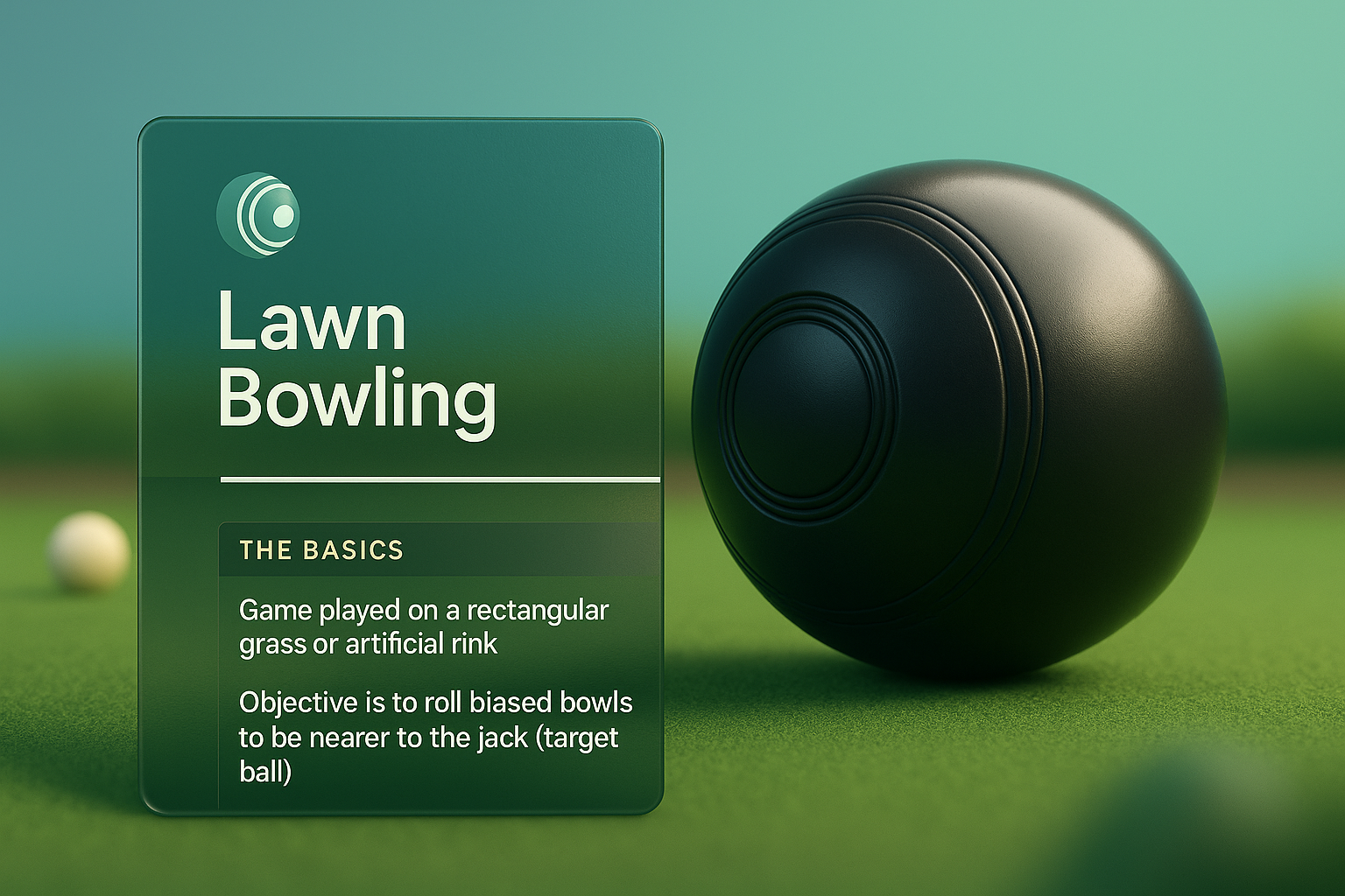 A 3D illustration featuring a lawn bowling ball and an informational card. The card provides details about the game and its objective, set against a smooth gradient background.