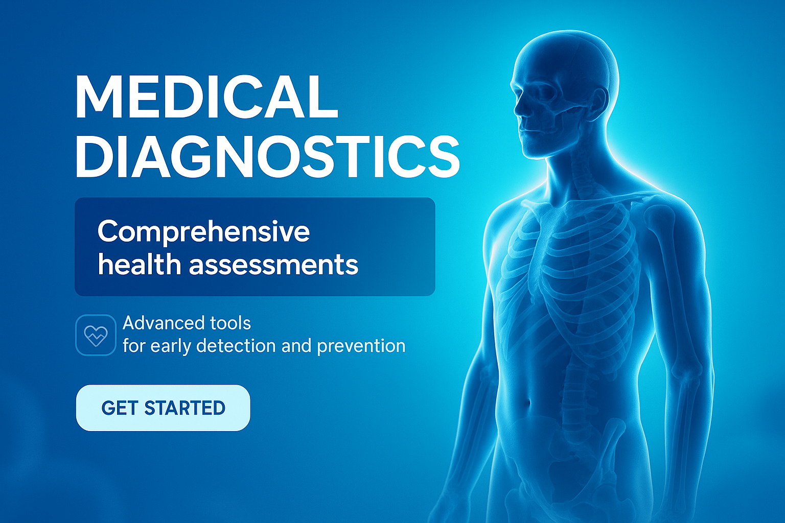 /Collection: /by davooda/Type: PNG/This image is a promotional banner for medical diagnostics, featuring a stylized human skeleton against a blue background. It targets individuals seeking health assessments.