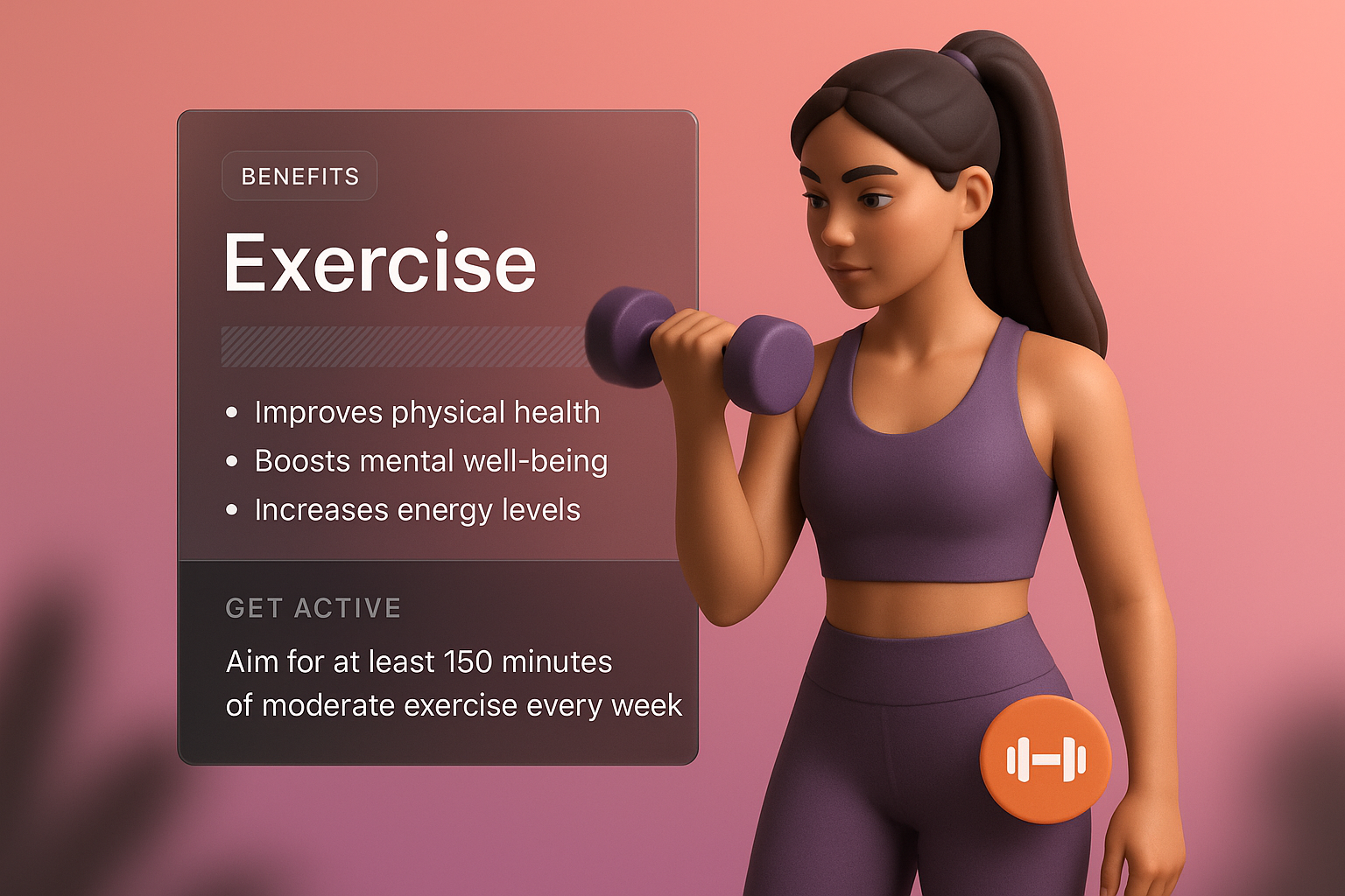 /Collection: /by davooda/Type: PNG/A 3D character holding a dumbbell highlights the benefits of exercise. The design features a smooth gradient background and informative text blocks with a modern aesthetic.