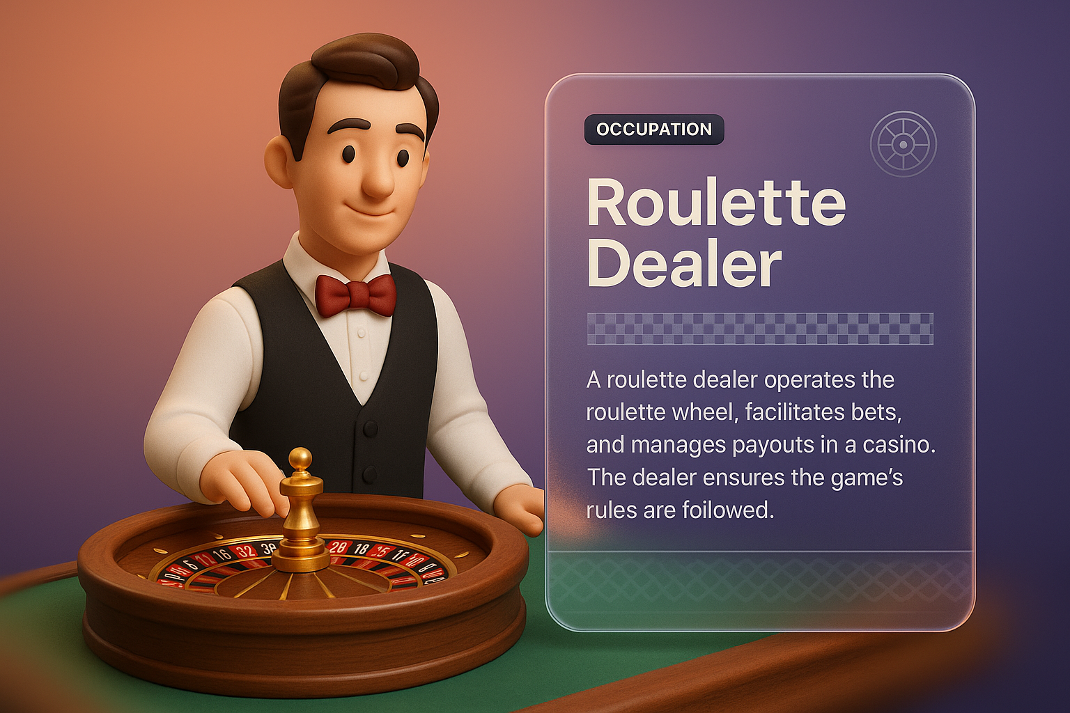 /Collection: /by davooda/Type: PNG/A detailed 3D illustration of a roulette dealer standing beside a roulette wheel. The background features a smooth gradient, enhancing the casino atmosphere. Informative text block included.