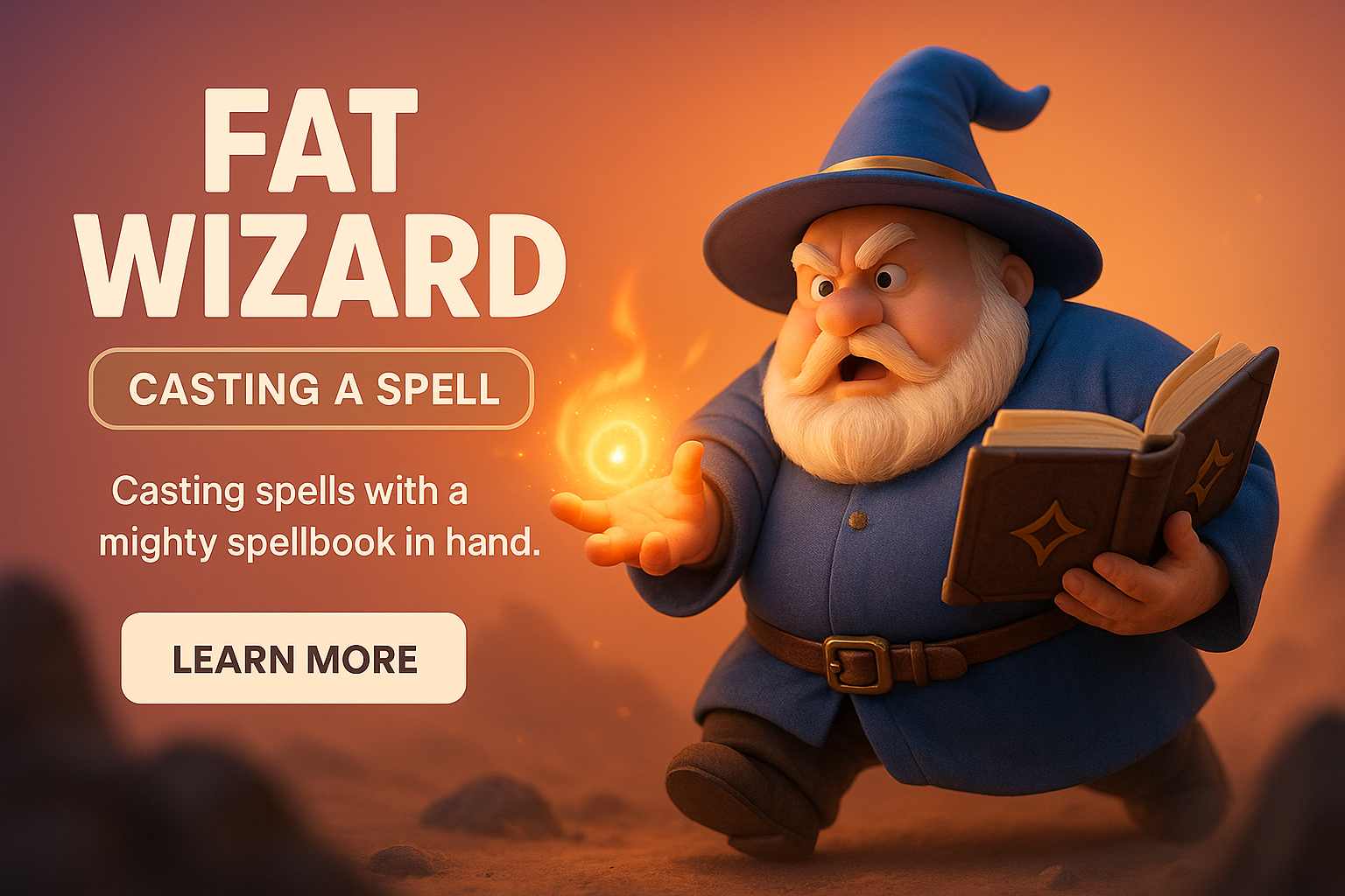 A vibrant and playful illustration featuring a plump wizard casting a spell, holding a spellbook. Ideal for fantasy-themed content and gaming.