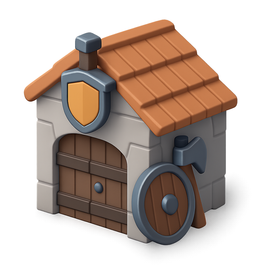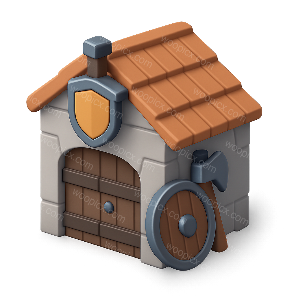 A charming 3D armory icon features a small building with a sloped roof, wooden door, and shield emblem. The design includes an axe and wheel, showcasing a playful isometric style.