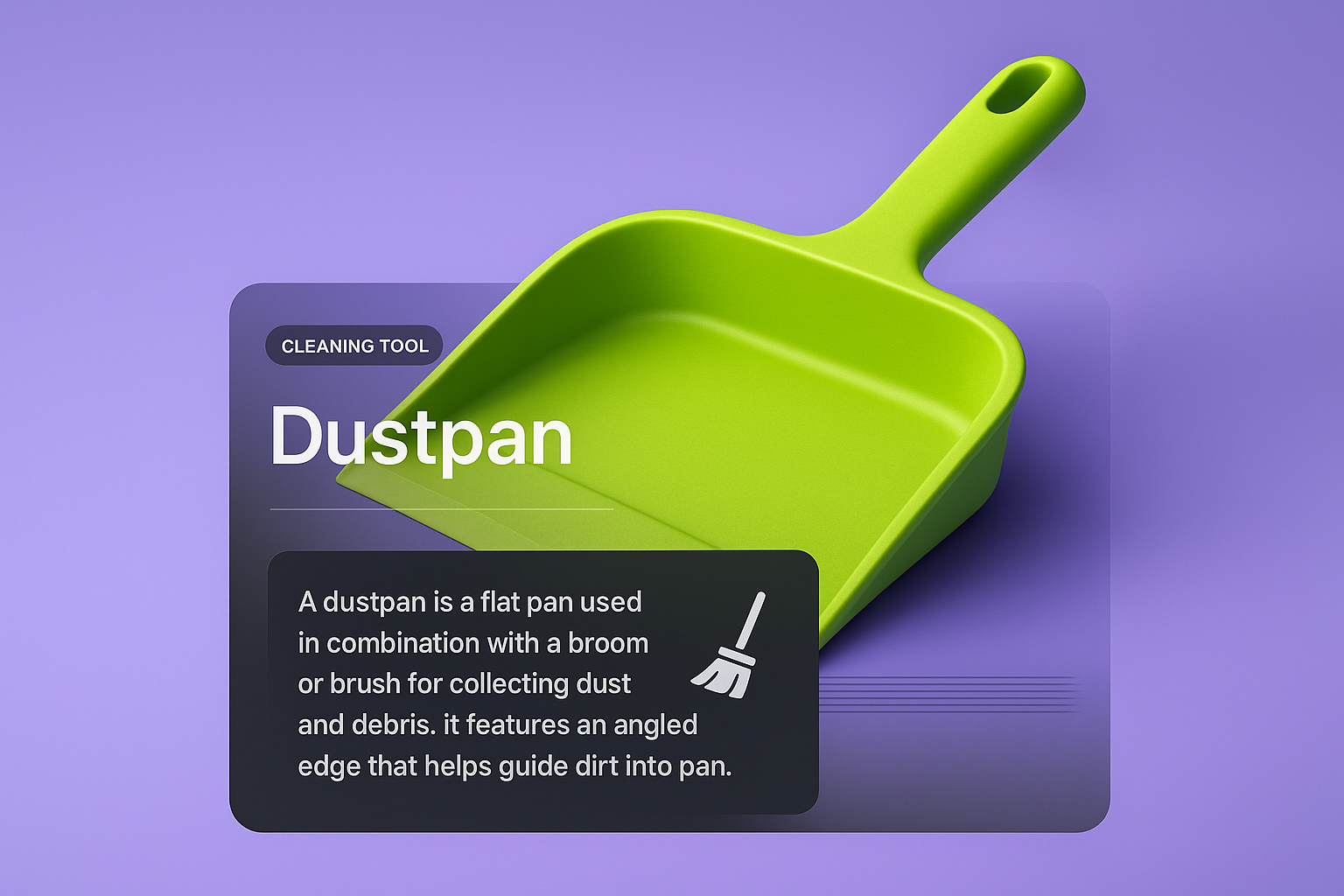 A vibrant 3D illustration of a green dustpan against a purple background, featuring an informative text block that describes its use and design.