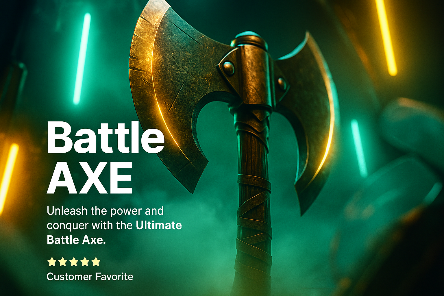 /Collection: /by davooda/Type: PNG/A visually striking promotional slide featuring a realistic battle axe, surrounded by neon lights and a misty ambiance, emphasizing power and appeal.