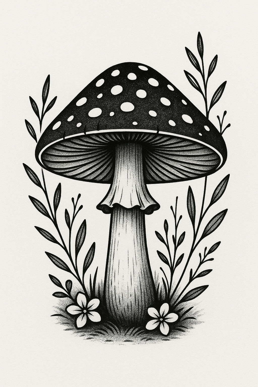 A detailed black and white illustration of a mushroom surrounded by floral elements, perfect for nature-themed art, decor, or botanical studies.